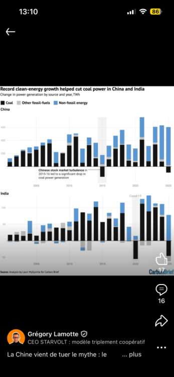 5. “La Chine vient de tuer le mythe : le fossile peut baisser même quand la demande explose. Pendant que certains expliquent encore que « la transition, c’est compliqué », la Chine vient de faire un truc très simple : 👉 faire baisser le fossile. 👉 tout en augmentant massivement sa consommation d’électricité. Pour la première fois depuis plus de 10 ans, la production électrique fossile chinoise recule. Pas parce que l’économie ralentit. Pas parce que les gens consomment moins. Mais parce que les renouvelables ont pris le dessus. 💥 Solaire. 💥 Éolien. 💥 Stockage. Résultat : la croissance de la demande est absorbée… sans charbon supplémentaire. Et là, il faut s’arrêter deux secondes. Parce que si le pays le plus carboné du monde, avec une industrie lourde, des data centers, des voitures électriques, réussit à décorréler croissance électrique et fossiles… 👉 alors le problème n’est plus technique 👉 il est politique, culturel et mental. ⚠️ Message aux climato-sceptiques mous ⚠️ Message aux pseudo-réalistes ⚠️ Message à ceux qui expliquent que « le renouvelable, c’est bien mais pas suffisant » C’est faux. Ce n’est plus une promesse. Ce n’est plus un scénario. C’est un fait. La vraie leçon est brutale : 👉 Le fossile ne disparaît pas parce qu’on l’interdit. 👉 Il disparaît parce qu’il devient inutile. Quand le solaire sort à midi. Quand l’éolien tourne la nuit. Quand le stockage lisse les pics. Quand l’intelligence énergétique fait le reste. Le charbon devient juste… ringard. 🔥 Conclusion (et ça pique) : Ceux qui disent encore « on n’a pas le choix » « on n’est pas prêts » « c’est trop tôt » ne décrivent pas la réalité. Ils décrivent leur retard. Le futur énergétique n’arrive pas. Il est déjà là. Et il ne demande pas la permission. 💣 À partager si tu penses que le débat n’est plus “faut-il accélérer ?” mais “qui va se faire dépasser ?”” https://www.linkedin.com/posts/grégory-lamotte-bb31421b_la-chine-vient-de-tuer-le-mythe-le-fossile-activity-7419640121236328449-3A2d?utm_source=share&utm_medium=member_ios&rcm=ACoAABPob0YBtorDRELEOuHGbxqFzjbn5Je6fYI ce pays si souvent critiquer car gros polluant. Un pays polluant qui se soigne. j’aime particulièrement c’est propos démonstratif sur une réalité qui montre le chemin de la réalité. ce jour je recharge ma voiture électrique avec le surplus non consommé par la maison et cela en plein mois de janvier un vrai mois d’hiver.😉