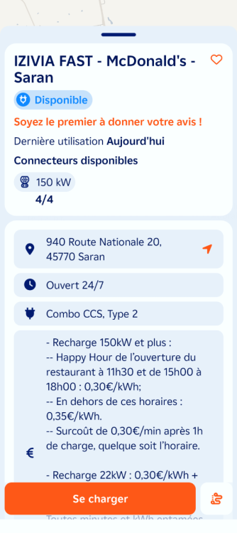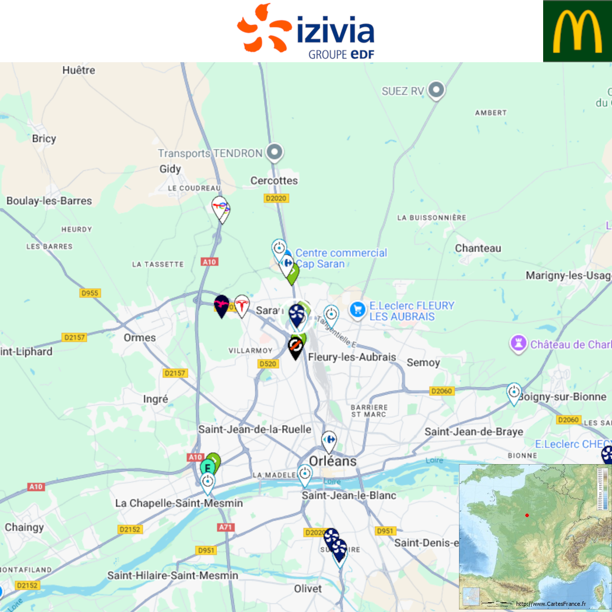Ouverture d'une station Izivia à Saran (McDonald's). 4x 150kW CCS Comme d'habitude, retrouvez le lien vers ma carte : https://tinyurl.com/StationsVE Toute l'actu des stations de recharge sur le groupe FB : https://tinyurl.com/GroupeFacebookVE -