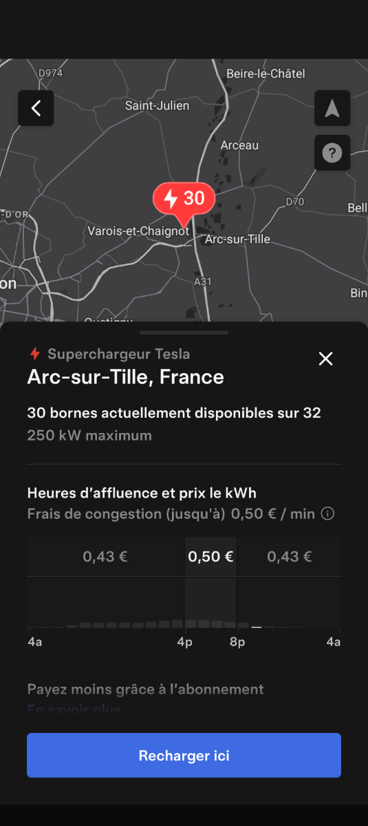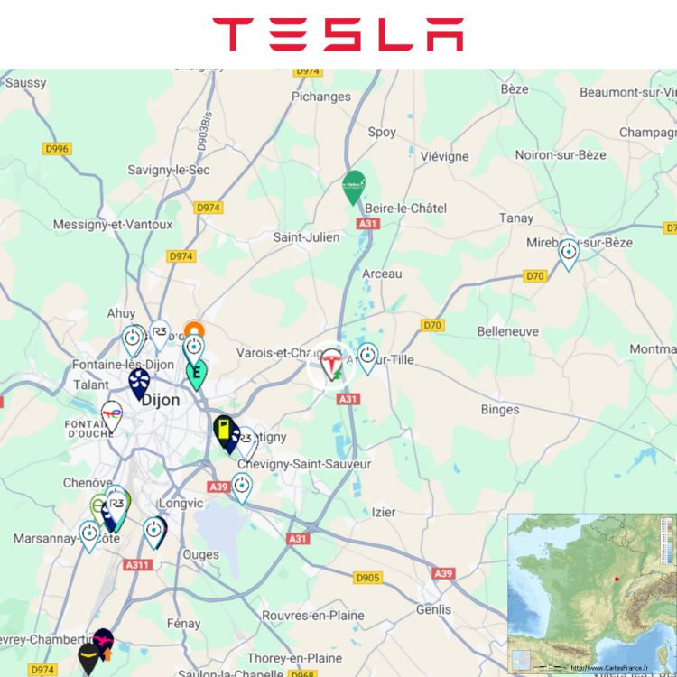 Agrandissement terminé d'une station Tesla à Arc-sur-Tille. Ajout de 12x 250kW CCS Soit 32x 250kW CCS Prix sans abonnement/non Tesla sur la capture Comme d'habitude, retrouvez le lien vers ma carte : https://tinyurl.com/StationsVE Toute l'actu des stations de recharge sur le groupe FB : https://tinyurl.com/GroupeFacebookVE