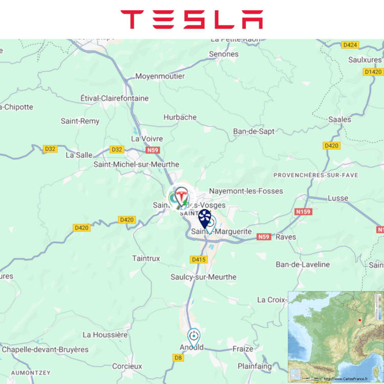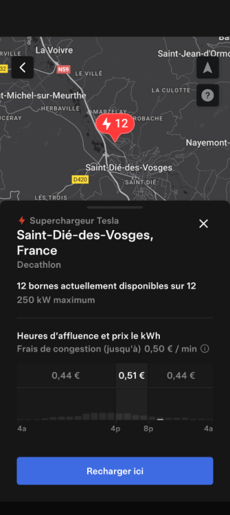 Agrandissement terminé d'une station Tesla à Saint-Dié-des-Vosges (Décathlon). Ajout de 4x 250kW CCS Soit 12x 250kW CCS Prix sans abonnement/non Tesla sur la capture Comme d'habitude, retrouvez le lien vers ma carte : https://tinyurl.com/StationsVE Toute l'actu des stations de recharge sur le groupe FB : https://tinyurl.com/GroupeFacebookVE