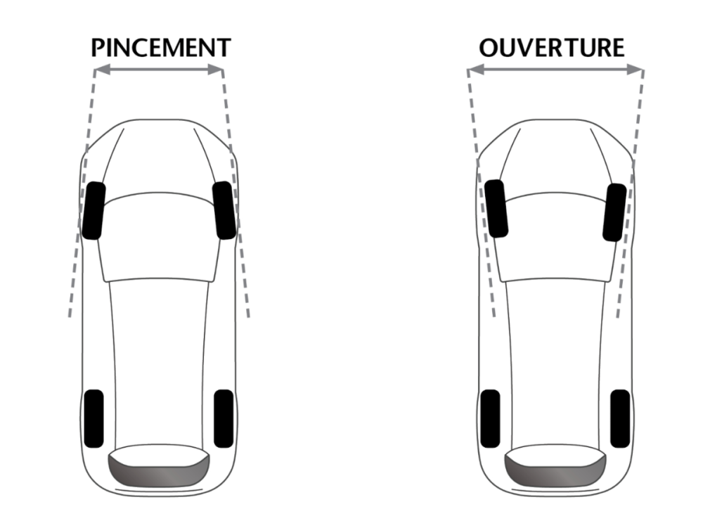 Il s'agit d'un problème de pincement : c'est comme avoir les pieds pointant en dedans quand les roues pointent vers l'intérieur (comme le strabisme convergent) les pneus s'usent sur l'extérieur la voiture a tendance à surbraquer (elle tourne trop : appui sur la roue extérieure qui pointe exagérément vers l'intérieur du virage). On doit corriger en modifiant l'angle de braquage Il s'agit d'un problème d'ouverture : c'est comme avoir les pieds "à la Charlot" quand les roues pointent vers l'extérieur (comme le strabisme divergent) les pneus s'usent sur l'intérieur la voiture a tendance à sousbraquer (elle ne tourne pas assez :appui sur la roue extérieure qui pointe exagérément vers l'extérieur du virage). On doit donc braquer davantage Chaque véhicule a des cotes à respecter avec une plage de tolérance : si les valeurs réglées sont en dehors des tolérances, le véhicule a un défaut qui impacte l'usure et rend difficile la conduite, en particulier sur des surfaces à mauvaise adhérence (pluie, neige, rafales de vent). Dire "un défaut de parallélisme" c'est utiliser un mot valise, ça n'indique pas le problème. Pour apprendre tous les termes et impacts utilisés pour régler un train (carrossage, angle de chasse,...) faire une recherche dans le modélisme auto. C'est très pointu mais hyper-instructif. Le fils d'un ami de boulot a fait le championnat d'Europe et son père était le préparateur 😉