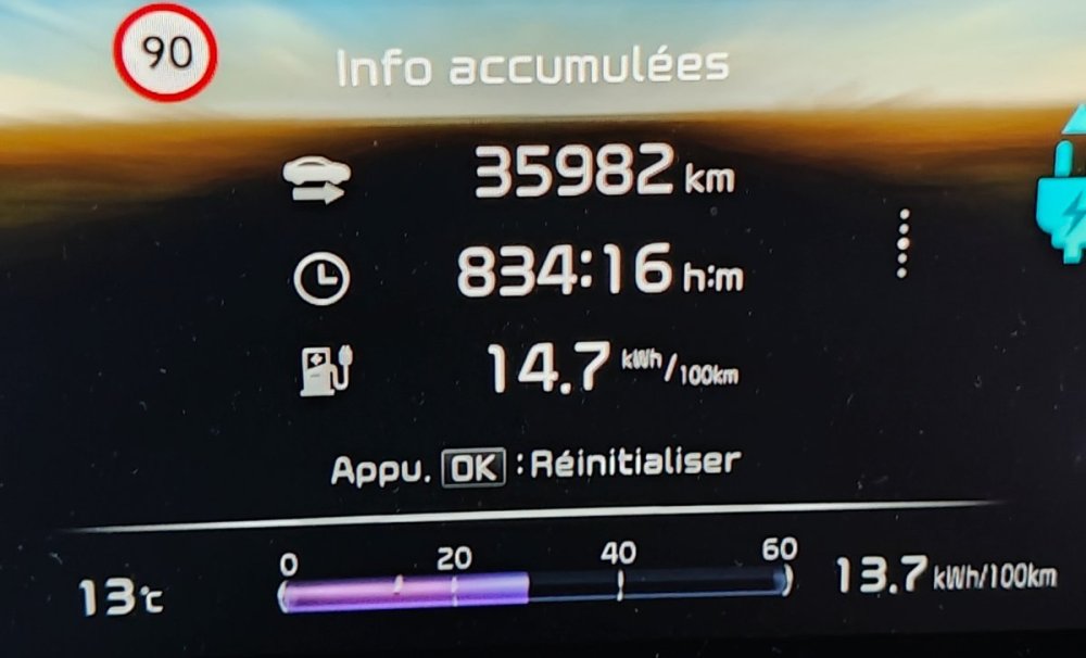 Bonsoir, Voilà 2 années complètes de conduite de cette Niro EV en finition Pace (BE), 14,7 kWh / 100 km de moyenne générale sur presque 36000 km avec une vitesse moyenne de 43 km/h. Elle fait dodo au garage depuis un peu plus d'1 an. Côté recharge, la moyenne est de 16,7 kWh/100 km (95% des recharges à la maison), ça fait 13,6% de perte (sur la base des 14.7).