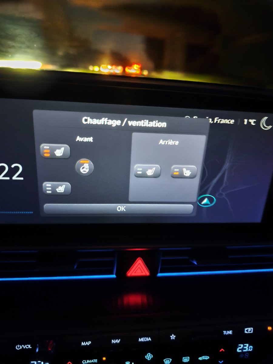 Bonjour, Vu le temps actuel, nous utilisons la fonction chauffage des sièges avant. En général, je mets les 2 sièges avant sur la position 2, et quand ma femme commence à se plaindre que c'est trop chaud, alors je réduis. Mais, régulièrement, je n'y arrive pas... J'ai l'écran ci-joint, alors que j'avais réussi à mettre en route le chauffage côté passager. Cela ne m'arrive pas tout le temps, mais dans 60% dans cas quand même, donc c'est assez embêtant sur autoroute, car il faut s'arrêter pour arrêter le chauffage côté passager. Quelqu'un a déjà rencontré le problème ?