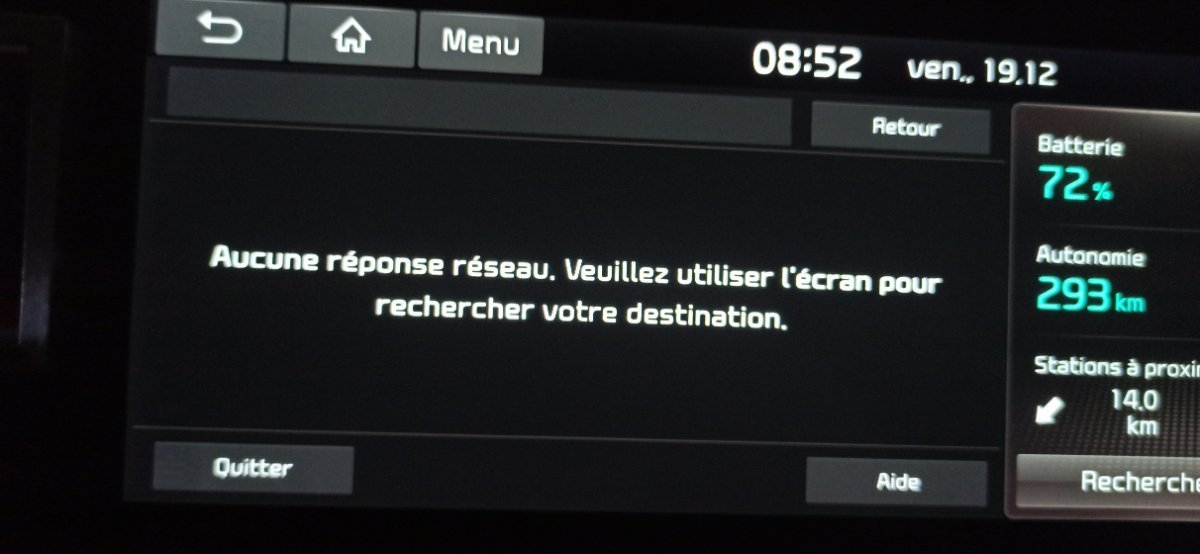 Bonjour à tous, Depuis un certain temps, le GPS ne répond plus lorsque j'utilise la commande vocale sur mon e-Niro 2020: Lorsque j'active la commande vocale pour trouver une adresse, il me répond : "Aucune réponse réseau" et il me renvoie vers l'écran du GPS. Auriez-vous une idée de ce qui provoque cette non-réponse depuis un certain temps déjà ? Merci d'avance pour vos réponses.