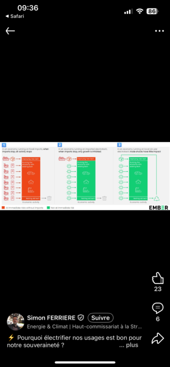 “Pourquoi électrifier nos usages est bon pour notre souveraineté ? 1️⃣ Une voiture thermique ou une chaudière à gaz, c’est 20 ans de dépendance aux importations fossiles. 2️⃣ Une voiture électrique ou une pompe à chaleur, c’est 20 ans d'indépendance énergétique, grâce à une électricité produite en grande partie chez nous. Bien sûr, cela suppose, parfois, d'importer initialement les panneaux solaires, les voitures électriques ou les pompes à chaleur. 3️⃣ Mais contrairement aux énergies fossiles qu’on brûle, ces équipements peuvent être recyclés, chez nous. ✔️ Électrifier, c'est un choix souverain.” https://www.linkedin.com/posts/simonferriere_pourquoi-électrifier-nos-usages-est-bon-activity-7379202104877322240-2_Ti?utm_source=share&utm_medium=member_ios&rcm=ACoAABPob0YBtorDRELEOuHGbxqFzjbn5Je6fYI Voilà pourquoi acheter une voiture thermique neuve est une grosse erreur, de plus on a toujours la possibilité de l’acheter en occasion et de rendre la possibilité au vendeur de lui en acheter une électrique 😁