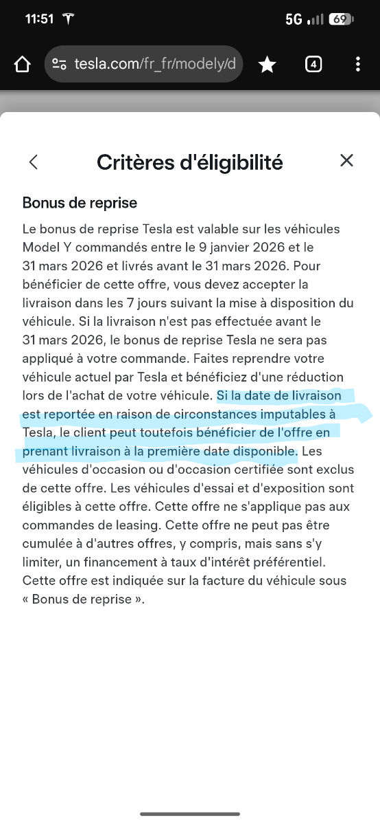 Aïe, ça risque d'être pareil pour moi alors... Ah oui, après vérification, c'est passé à mai-juin... crotte!... Quand tu as commandé, si c'était annoncé mars (ça figure sur le bon de commande) et que c'est Tesla qui l'a repoussé, alors tu y as droit quand-même normalement... Enfin, les détails ne sont pas clair... - Aujourd’hui