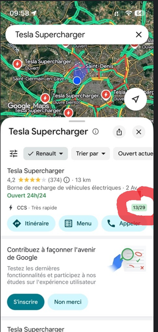 bonjour, Je me suis aperçu ce week end que la disponibilité des stèles sur un SUC Tesla apparait dans Google Maps. A priori c'est une évolution qui date du 14/11. Je trouve cela pratique. Cela évite dans le devoir vérifier dans l'appli Tesla surtout quand tu es seul ou si les autres dorment. -