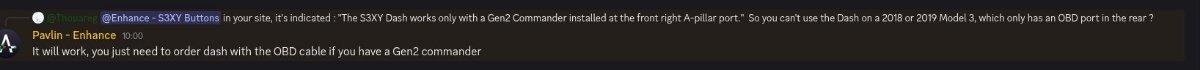 Je ne vois pas comment tu comptes l'installer, il n'y aura pas le port OBD à cet endroit là. J'ai eu la réponse du staff Enhance sur cette question : Je suppose qu'il parle de ce câble là, à commander avec donc le dash en standalone. https://www.enhauto.com/products/tesla-gen-2-cable?variant=41214470160459