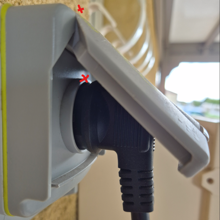 Boitier IP67 , mais fiche IP44 Et une fois branchée ,çà ne peut être étanche avec des pluies continues ou violentes ! Chez moi sous abri , cable Hyundai + green up , le clapet du couvercle ,fait une gorge qui ,à l'extérieur doit être remplie en 5' . Perso ,je n'aurais pas mis une prise renforcée à tous vents ,sans mettre une solide casquette ......