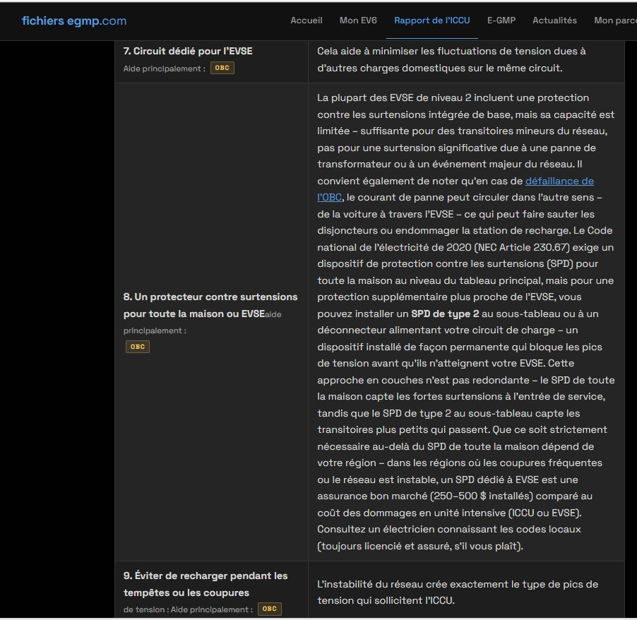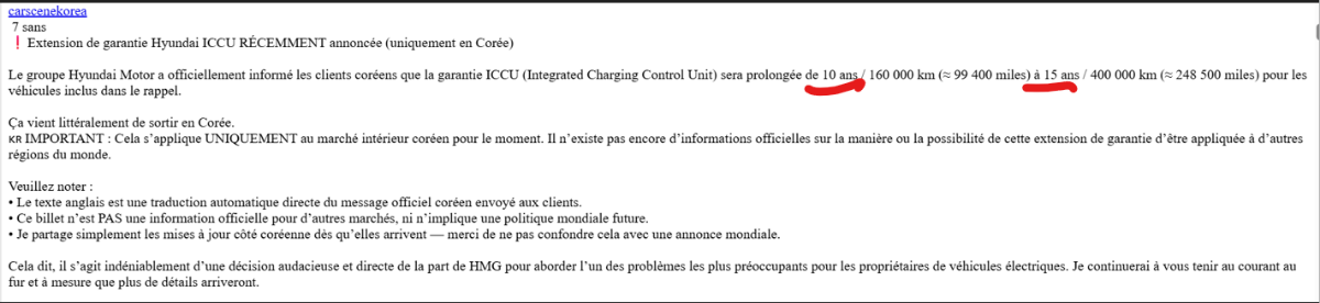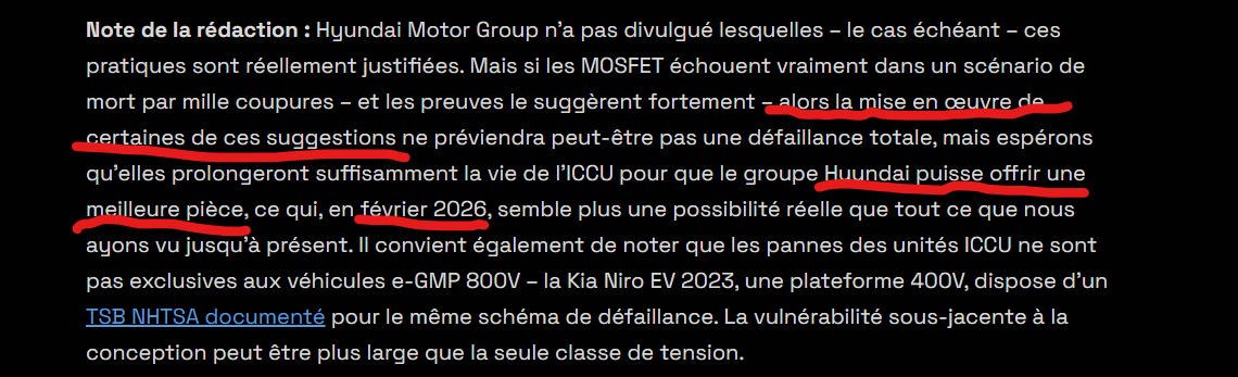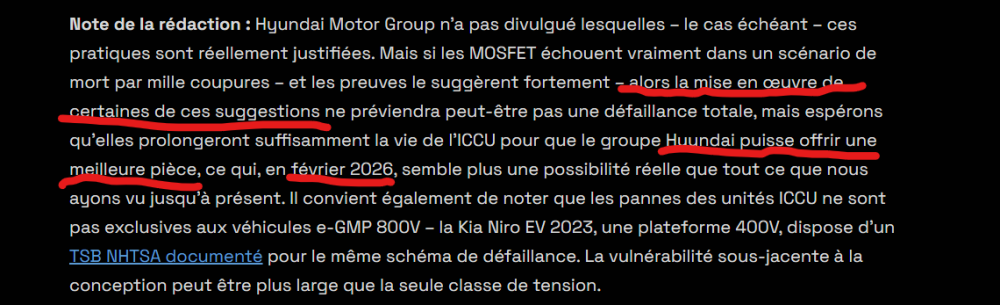 Merci de nous faire part de ce partage de connaissances ,vraiment trés ,trés interessant . J'ai retenu : Ca recoupe bien ,ce que j'ai déja lu à ce propos : les surtensions peuvent etres une des causes de panne . S'efforcer d'avoir un courant stable pour la charge de nos VE ! Pour le point 9 ( éviter les coupures ) tous les possesseurs d'installation photovoltaique ,qui chargent avec le surplus devraient se poser la question ,est ce bien judicieux d'avoir des dizaines de coupure ,quand on veut absolument récuperer le moindre kW. Une note d'espoir : Tous les VE ,ne sont pas touchés et heureusement . Pour ceux concernés ,c'est peut etre un cumul malheureux de toutes les causes potentielles . Un seul ex simple décrit :peut etre faut il éviter de prevoir à la suite d'une nuit de charge ,chauffage habitacle et siége chauffant .... Bien sur ,pas normal d'etre obligé de faire cà ,pour avoir un VE fonctionnel ,mais si ca permet de rouler en attendant une solution définitive par HMG . Peut etre la solution à ete trouvée avec un ICCU fiable , cela expliquerait pourquoi la garantie en Corée à ete prolongée ....