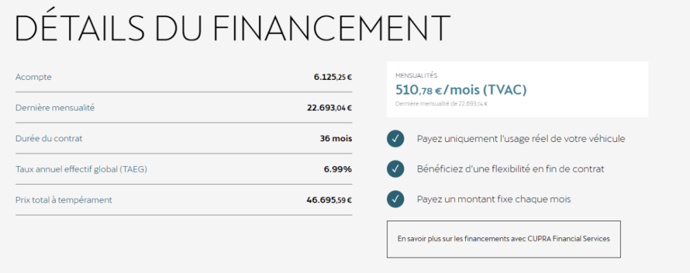 En fait le système Belge VAG est légèrement différent d'une LOA. Ils appellent ça "auto crédit", c'est plus un crédit avec promesse de reprise à un prix préétabli mais dans les fait, ça revient pratiquement au même. Donc, oui, il y avait le prix de départ moins le premier loyer (de ce que j'ai compris) et un bouquet final calculé sur le prix supposé en fonction du kilométrage (le 36eme mois) Le prix de reprise a couvert le premier loyer et le reliquat à diminuer les 35 mensualités sans influencer le dernier montant à payer. Je vois qu'ils ont un peu revu leur calcul puisque la dernière mensualité est devenue moins chère, sans doute pour mieux correspondre aux prix de l'occasion, mais avec les 35 mensualité plus chère. De mémoire, quand j'ai pris la mienne, il y avais normalement des mensualité de 380€ à peu près qui ont donc été ramenée à 175€. Voici ce que ça donne actuellement, je crois que je n'aurais pas eu facile à m'en offrir une à 510 euros par mois