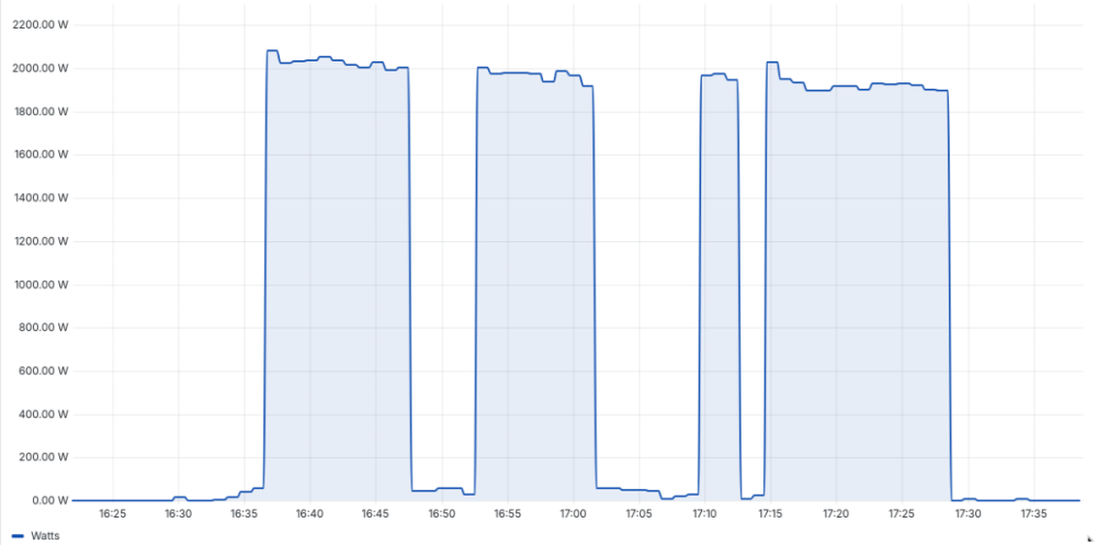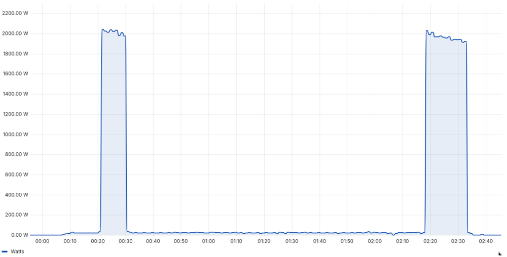 Attention, le cycle court consomme plus d'électricité (sur mon LV en tout cas): - 36mn à 2000W en cycle rapide 1h - 24mn a 2000W en cycle longe 3h Voilà les graphiques de conso, attention à l'échelle de temps qui est différente sur les deux graphiques. Le calcul le plus optimal et le cycle long en arrivant à caller la chauffe de l'eau ou la chauffe de séchage dans les HC (avec l'autre pic en HP) qui coûtera quand même moins cher que de mettre en cycle court pendant les HC. -
