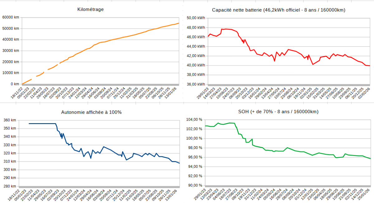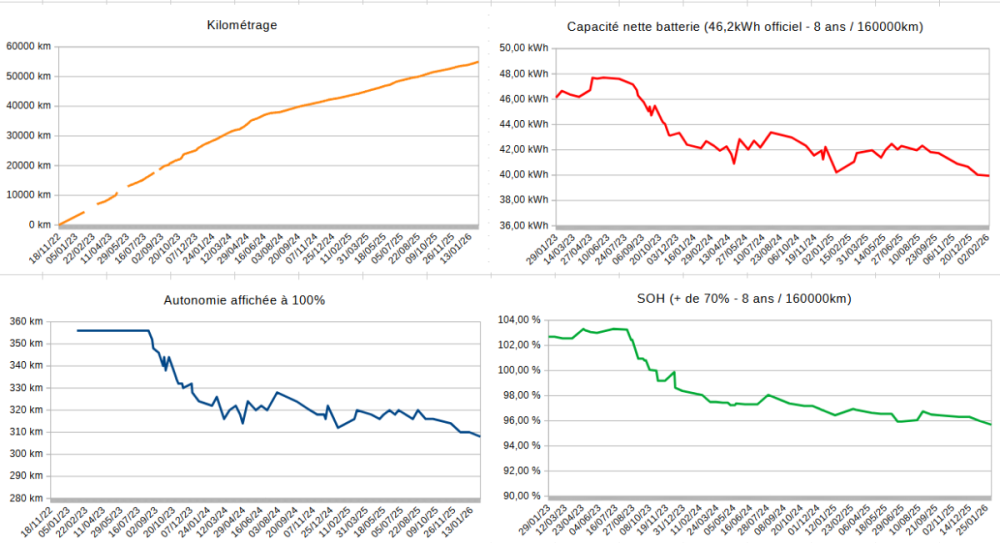 Bilan des 56000km SOH 95.69% Capacité 39.95kWh On est sur le plus bas de l'hiver. 308km à 100%. Très faible dégradation de la batterie sur 1 an. -