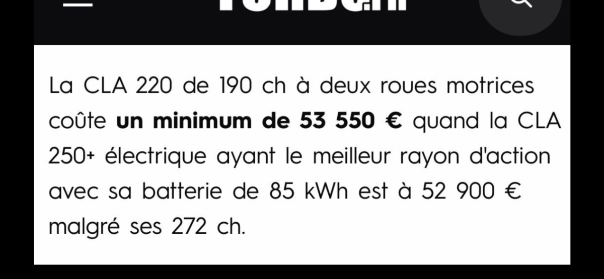Pourquoi les consommateurs devraient acheter des voitures thermiques où hybrides alors quelles sont plus cher? Et en plus elle est plus puissante entre autre. l’exemple d’une voiture qui plait beaucoup la CLA de Mercedes -
