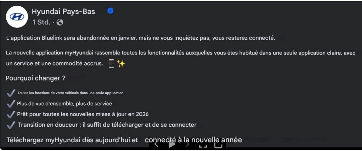 Attention , avis à tous pour la fin prochaine de l'application Bluelink ....... Remplacée par My Hyundai . Vu sur Hyundai.com/de , cette info : L'info client est vraiment différente suivant le pays ...... Par principe de précaution , je conseille à tous ceux qui ne l'ont pas fait ,de basculer sur My Hyundai , sans trop attendre ..... Ce que j'ai fait ,depuis quelque temps ,sans souci aucun , on télécharge My Hyundai ,et on récupère ,tous les identifiants etc ... de l'application Bluelink . Par contre ,pas sur que si on attend le dernier moment ,çà se passe aussi bien 🤨 Ne pas hésiter ,My Hyundai fonctionne bien 😄