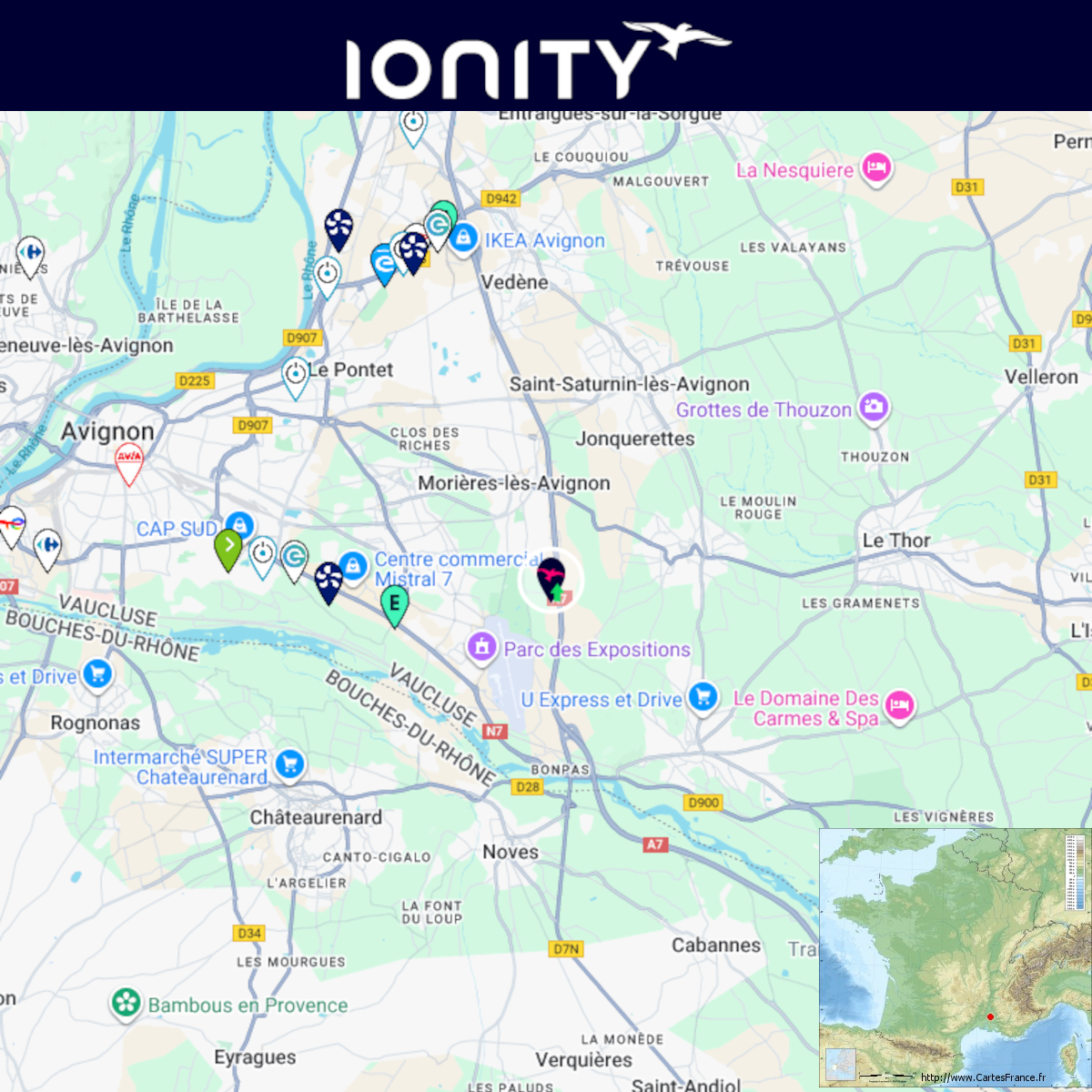 8. Agrandissement terminé d'une station Ionity sur l'A7 (Aire de Morières). Ajout de 6x 400kW CCS Soit 6x 400kW CCS 4x 350kW CCS 1x 50kW tristandard Comme d'habitude, retrouvez le lien vers ma carte : https://tinyurl.com/StationsVE Toute l'actu des stations de recharge sur le groupe FB : https://tinyurl.com/GroupeFacebookVE