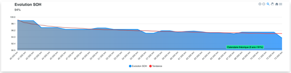 @as1chrone Petite mise à jour de mon coté. Le SOH continue à se stabiliser mais a pris un petit coup dernièrement. Légère baisse en passant de 95,7% à 94% mais toujours en dessous de la dégradation théorique calendaire (à 5 ans il devrait être autour de 91%). Les données: - Modèle: IONIQ5 73 kWh Executive - Mise en circulation: 11/2021 - Kilométrage: 73 000 km - SOH: 94% (Mesuré après recharge aujourd'hui de 32% à 100%) - Nb DC: 113 - Nb AC: 446 - Parking: Intérieur - Limite de recharge habituelle: 70-80% -