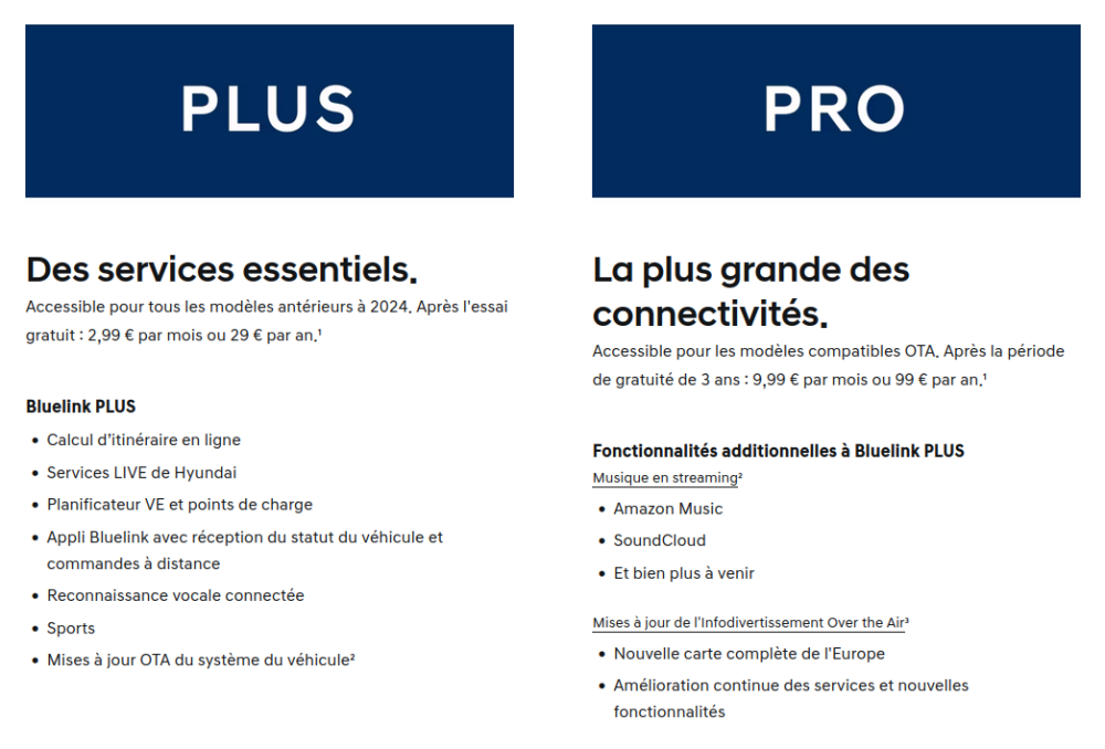 Les mises à jour OTA sont incluses dans l'abonnement Plus https://www.hyundai.com/fr/fr/entretien-services/services-connectes/connectivite-bluelink/abonnements-bluelink.html en bas de la page, "Modèles antérieurs à 2024."- 3 029 réponses