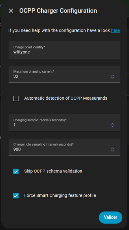 Après avoir ajouté un central ou configuré le central la borne est détectée. La borne est découverte. Après avoir cliqué sur Ajouter y a ça. Je configuration comme ça mais au lieu de 1 il faut mettre 10 sur "Charging sample interval (secondes)* En fait c'est les mêmes instructions que l'ajout de la borne sur mon post précédent. Si a la borne est déjà dans OCPP il faut supprimé le central auquel elle est rattachée. Ensuite il faut recréer un central sur le même port. Et attendre la découverte de la borne. -