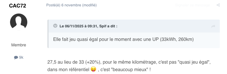 alors ouvre les yeux (pardon, facile) Tu es trop focalisé sur l'acheteur type, celui qui vient avec une idée de ce qu'il veut. Mais tous les profils ne sont pas le profil type : il y en a pour qui le pognon n'est pas un critère, et le prestige ou le confort le sont. Le vendeur n’omettra sans doute pas de préciser que c'est un hybride rechargeable, mais le client peut comprendre juste hybride, vu que le terme est joyeusement amalgamé pour décrire les rechargeables et auto-rechargeables. Tu as des cas similaires de confiance aveugle envers le vendeur chez les acheteurs de VE : on en a vu au moins un se plaindre qu'il ne pouvait pas faire les 300km d'autoroute attendus en hivers alors que le vendeur lui avait dit que sa Jaguar pouvait rouler une telle distance 🤷♂️ 🙄 Comme décidément tu ne sais jamais quand t’arrêter, à mon tour de faire un rappel : tu n'as toujours pas les compétences pour affirmer à ma place ce que j'ai écris. Et tu ne les auras jamais. Ce n'est pas malveillant hein, mais tant que tu ne sera pas dans ma boite crânienne, tu ne pourra jamais m'expliquer ma propre pensée. Donc, arrête d'essayer, tu nous fera gagner du temps à tous les 2, et a tous ceux qui souvent ces différents sujets . En revanche, si tu veux débattre de ce que j'ai écrit, pas de soucis. J'espère que tu saisi la différence entre ces 2 notions. Comme ce sujet à l'air de t'obséder et que tu sembles avoir guetté le moment idéal pour remettre ça sur le tapis et avoir absolument le dernier mot, entre 260km et 260km d'autonomie (non pas de faute) j'appelle ça jeu égal oui. Entre 27kWh dont je me suis pas occupé de vérifier si c'était brut ou net, et 32.3kWh utiles, j'appelle ça "quasi" jeu égal en effet. Sortir le pourcentage, c'est l'outil idéal pour tenter d'impressionner, d'autant plus quand les chiffres sont bas. Passer de 60 à 66kWh de batterie, c'est la même valeur brut que ce différentiel twingo/up, mais ça fait plus que 10% d'écart. Ridicule, hein ? Dans les 2 cas, ça reste la même différence potentielle d'autonomie. -