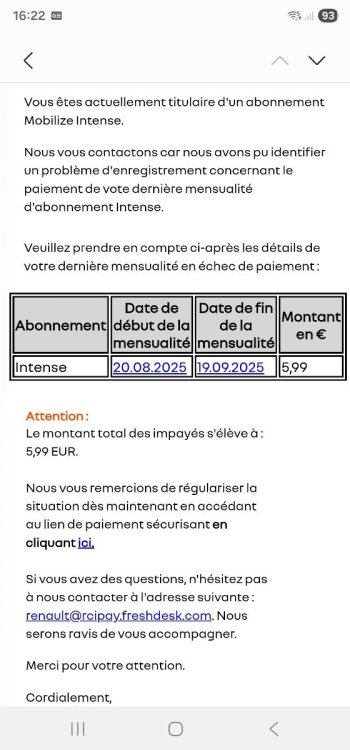 @Farfadet 25 Contactes les via l'application ? Ça pourrait être légal. Rci étant devenu Mobilize, et rci banque sont liés au group Renault. https://www.mobilize-fs.com/fr/actualites/rci-bank-and-services-devient-mobilize-financial-services-une-marque-commerciale-unique Mais c'est sur que leur utilisation des noms de sites internet n'est pas clair si c'est bien valide. Et les quelques fautes ou traductions peuvent prensez a du phishing Vérifies déjà que tu as bien eu les paiements/prélèvements lié a la période concernée. - Aujourd’hui
