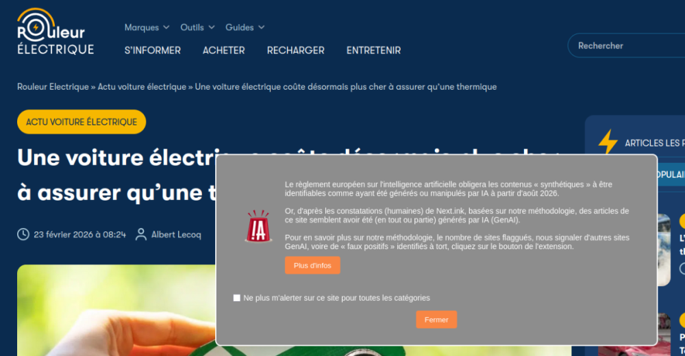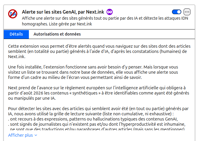 1- Je propose que la question et la réponse des assistants IA soit "citées" mais aussi que la réponse soit vérifiée avant d'être postée sur le forum. Ce n'est pas aux autres forumeurs de vérifier/corriger les hallucinations ou les questions mal posées. Ex.: 2- La reprise d'articles 100% générés par IA n'ont pas leur place sur le forum. Je vous conseille d'installer l'outil de next.ink pour avoir une alerte sur les sites générés par IA (Firefox et/ou Chome) ex.: Vous êtes d'accord ? Aimez ce post !