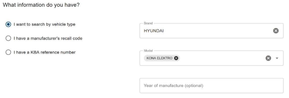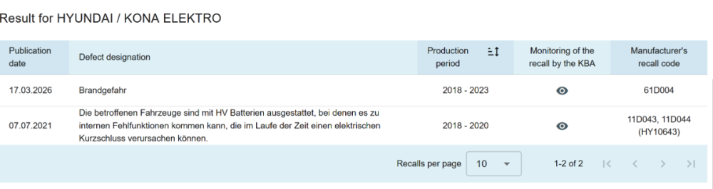 KBA est l'Autorité allemande pour les transports motorisés. https://de.wikipedia.org/wiki/Kraftfahrt-Bundesamt https://en.wikipedia.org/wiki/Federal_Motor_Transport_Authority Le site de KBA permet d'obtenir très facilement les rappels à faire pour les véhicules allemands https://www.kba-online.de/rrdb/buerger/ 1/ ENTRER LE TYPE DE VÉHICULE : 2/ RÉSULTATS : Le premier rappel, le plus récent, est celui qui nous intéresse: 17 mars 2026, "Risque d'incendie", période de fabrication du véhicule 2018-2023, code du rappel 61D004. Le second est celui qu'ont vécu certains d'entre-nous: 7 juillet 2021, "Les véhicules concernés sont équipés de batteries à haute tension, qui peuvent subir des dysfonctionnements internes provoquant un court-circuit électrique au fil du temps", véhicules concernés ioniq et kona produits en 2018, 2019, et 2020. Codes des rappels: 11D043, 11D044 (HY10643) En France, la source gouvernementale est : https://rappel.conso.gouv.fr/ Utiliser le moteur de recherche du site: https://rappel.conso.gouv.fr/categorie/0/1/kona https://rappel.conso.gouv.fr/categorie/0/1/kona ev Rien à signaler pour l'instant. Il est possible que le rappel allemand soit étendu à la planète, mais pas sûr. -