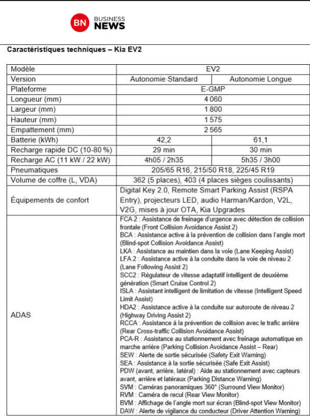 Nouvelle vidéo ,surtout intéressante pour listing caracteristiques techniques : Kia dévoile EV2, son SUV électrique le plus compact et le plus accessible - Business News Enfin ,si conforme ,des pneus 205/65 en base et non plus des tailles ultra basses qui n'ont pas de sens sur des petits VE , car dégradent fortement le confort . A suivre bientôt .....