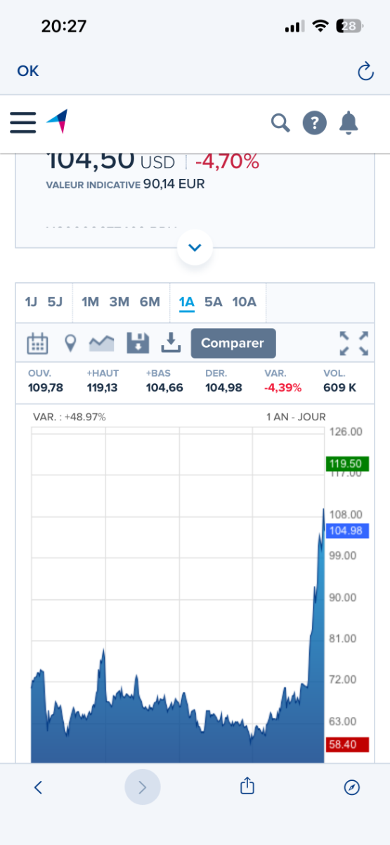 le cours du Brent est monté à 119$ dans la journée pour finir à 105 ce soir. Une hausse anecdotique s’éloigne jour après jour on est à +50%. Par contre l’embrasement s’élargit, la guerre bascule. Le gaz est de plus en plus impacté également. Un F35 touché mais pas coulé. -