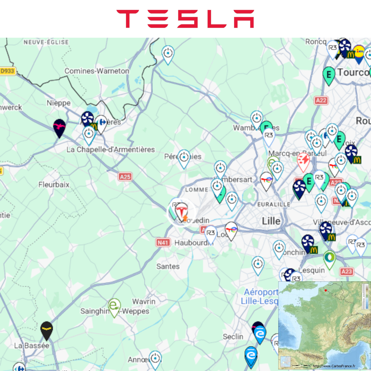 Agrandissement en cours d'une station Tesla à Englos (Auchan). Info et photo de Michel sur mon groupe FB Comme d'habitude, retrouvez le lien vers ma carte : https://tinyurl.com/StationsVE Toute l'actu des stations de recharge sur le groupe FB : https://tinyurl.com/GroupeFacebookVE -