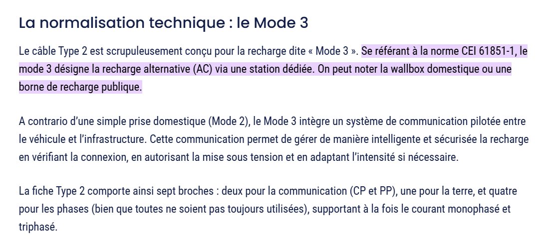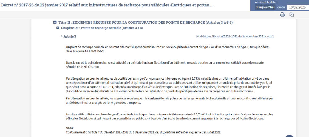 Attention ,pavé !!! Mon cable de recharge 16 A utilisé , montre des signes de faiblesse ,j'ai regardé pour un remplacement . Et trouvé finalement une borne 16A avec un prix canon ( détail en bas du pavé ) Une borne a toujours un meilleur rendement qu'une prise renforcée ,donc pourquoi se priver 😉 Contexte : Recharge Inster ,batterie 49 kWh ( utile 47 kWh ) , abonnement électrique 7 kVA ( suffisant pour mes besoins globaux ) , HC 1h40- 7h40 et 15h40-17h40 . tension matin/ soir :235 V/238V Pas de nécessité de passer à une borne plus puissante ( qui obligerait à changement abonnement ) Charge habituelle avec cable recharge 8- 16A ou cable Hyundai 6 à 12 A 16 A surtout pour 100 % équilibrage ou long trajet . Habituel 12 A ou complément photovoltaïque . 7 m de cable 4mm2 entre compteur MID et prise Green up actuelle . Pas de lecteur OBD , Mais ODB Inster suffisamment précis pour avoir des données satisfaisantes pour le calcul ( la conso affichée correspond à la réalité ( vérifié )) Conditions de ce test : Journée pluvieuse avec T° de 8° le matin et 8.7 ° fin de journée VE qui n'a pas bougé de 24 h , sous abri à tous vents .( donc pas meilleures conditions ) Avec borne 16 A recharge 2 h 5h30-7h30 conso 7.21 kWh ,+13% dans la batterie soit + 6.11 kWh soit pertes de 1.10 kWh ou 15.26 % Avec cable 16 A recharge 2h 15h40-17h40 conso 7.26 kWh , + 12% batterie soit + 5.64 kWh soit pertes de 1.62 kWh ou 22.31% On voit qu'avec une conso identique ,le rendement est défavorable avec le cable . Avec -0.47kWh ( rajoutés dans la batterie pour 12 % de batterie ),on arrive à 3.13 kWh envolés pour "un plein de 80%" En regardant mes relevés et en extrapolant ,je pense arriver avec la borne à diminuer les pertes à 10-11 % /15% mini sur tous mes relevés . Les conditions favorables ,c'est toujours recharger après un roulage et pas le lendemain ...... La borne qui va compléter la prise Green up Borne DELTA AC MAX BASIC ,158.98 € . 1er choix ADAC , le plus bas prix peut être le meilleur choix : Günstige Wallboxen im ADAC Test: Wie gut sind sie? Rappel mode 3 ( sécurise et autorise la mise sous tension : Avis Promotelec ( qui n'est pas une norme ni une loi ) : Mais !!!!!!, les fiches des prises T2 des bornes de recharges ne sont pas sous tension tant qu'elles ne sont pas branchées et qu'un protocole de communication ne l'a pas autorisé de sorte qu'elles ne présentent aucun risque . Cette prise peut meme être manipulée sous la pluie sans danger ( voir vidéo ci dessous ) . Pas de tension si pas branché ,il ne devrait meme pas y avoir de débat ...... Décret pour IRVE ( obligatoire pour borne sup. à 3.7kW): Article 3 : Par dérogation : possible socle de prise de courant type E ,mais " dont la fonction principale n'est pas de recharger des véhicules électriques " On marche sur la tête ,on peut installer des prises de recharge renforcées ,mais pas pour recharger tous les jours si besoin des VE ..... C'est la France ,quoi , avec la bureaucratie qui pond des lois inapplicables .... Pour terminer une vidéo : Tesla Charger Water Rains💦 #tesla #memes #pourtoi #highland - YouTube J'ai installé cette borne pour mon confort personnel ,actuellement sur ma prise Green up ,le cable de recharge reste à demeure . Quelle est la différence avec cette borne avec cable attaché utilisée en monophasé 16 A ? De plus elle sera alimentée seulement en cas d'utilisation avec un contacteur connecté . Donc oui ,bon matériel ,bonne construction pour 158.98 € livré en 48h domicile ,sur bien protégé .😀 Materiel qui offre plus qu'une prise renforcée ,clé pour verrouiller l'accès par ex .....
