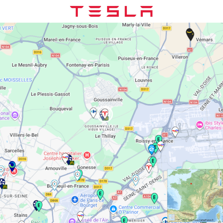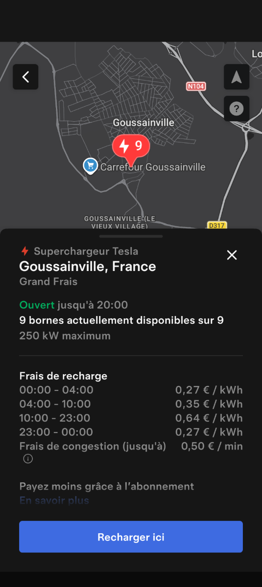 Ouverture d'une station Tesla à Goussainville (Grand Frais). 9x 250kW CCS Prix sans abonnement/non Tesla sur la capture Comme d'habitude, retrouvez le lien vers ma carte : https://tinyurl.com/StationsVE Toute l'actu des stations de recharge sur le groupe FB : https://tinyurl.com/GroupeFacebookVE -