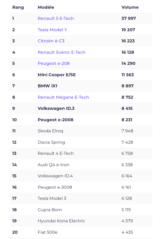 j'avais lu que le one pedal arriverait avec la production de février (l'Argus annonçait janvier). Donc ça doit être imminent. Pour être sûr, mieux vaut attendre la livraison du 1er exemplaire équipé des palettes... Pour la batterie, je pense pas que ce soit prévu dans l'immédiat. Les batteries françaises n'équipent pour l'instant que le Scénic 87kWh si j'ai bien compris. Donc avant que l'usine fournisse la R5... (je sais même pas si c'est vraiment prévu). Le palmarès france des VE en 2025 n'a pas été posté ?! (avec les versions Alpine ça fait même plus de 40.000 ex! Et la R4 n'a que 7 mois de commercialisation je rappelle). -