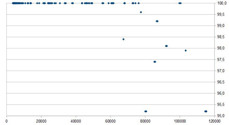 Ma e-Soul a maintenant 5 ans et 116000km. Voici un graphique qui décrit le SOH lu par mes soins avec car scanner à de multiples reprises. En abscisse le kilométrage.