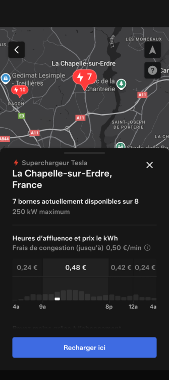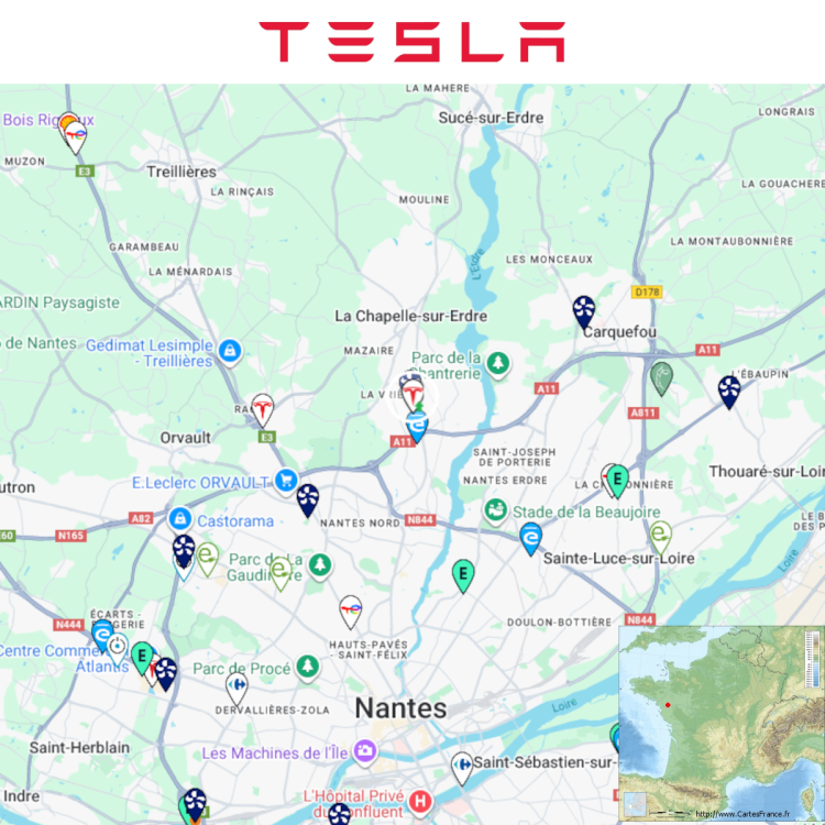 Remplacement des bornes d'une station Tesla à La Chapelle-sur-Erdre (Westotel Nantes Atlantique). Travaux terminé, les 8x250kW ont remplacé les 8x150kW Prix sans abonnement/non Tesla sur la capture Comme d'habitude, retrouvez le lien vers ma carte : https://tinyurl.com/StationsVE Toute l'actu des stations de recharge sur le groupe FB : https://tinyurl.com/GroupeFacebookVE -