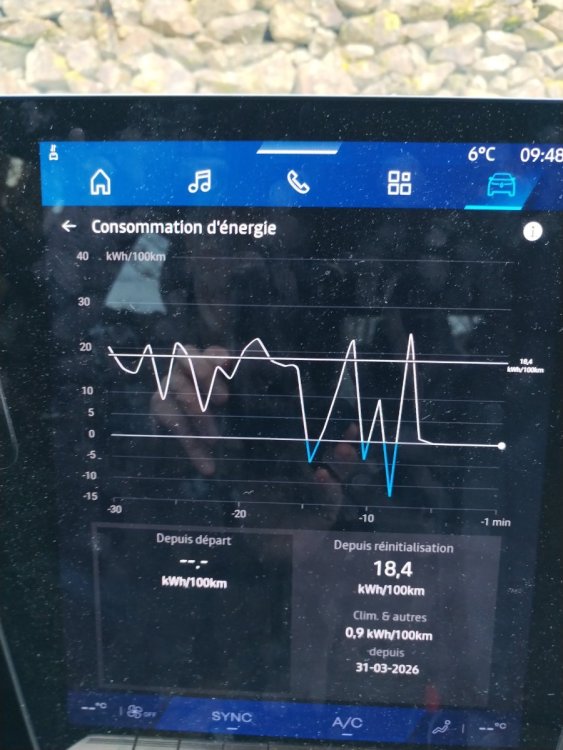 Bonsoir, Bonjour à Tous . Hier j'ai eu l'occasion de rouler sur l'autoroute. Même en roulant un long moment à 130 km/h avec le régulateur je ne suis pas parvenu à déterminer la consommation à cette vitesse ni plus loin à celle à 110 km/h. Comme déjà dit sur ce forum l'affichage de la pseudo consommation instantanée ne sert à rien. Si ce n'est à faire un joli graphique montagneux. J'ai pensé qu'il s'agissait d'un poisson d'avril. Hélas non à la fin du trajet l'affichage de la consommation moyenne de 18 kilowatt-heure au 100 km n'était pas accompagné de la vitesse moyenne (voir photo) Extraordinaire ! Le seul paramètre auquel nous avons accès c'est la consommation au 100 km mais il ne sert à rien. Car tout le monde est capable de consommer 10 kWh/100 km en roulant à 30 km/h (sans le dire) Mais vous avez raison, je me plains pour des broutilles. Je m'en suis rendu compte quand un propriétaire de Tesla m'a ouvert la portière conducteur. Sidérant il n'y a pas de tableau de bord. Enfin si comme il en avait marre de devoir tourner la tête vers le grand écran central pour connaître sa vitesse, il a rajouté un écran derrière le volant. En fait le Scénic e-Tech est super bien, il a un tableau de bord ! Avec une excellente réplication du guidage. TESLA est complètement dépassé. En fait qu'avons nous besoin de savoir quand le véhicule autonome décide de l'itinéraire, de respecter les limitations de vitesse et les autres usagers. Il peut même décider d'aller recharger et d'enclencher le preconditionnement de la batterie en loucedè. -