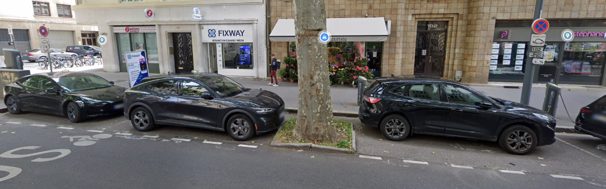 Si si c'est bien réservé à la recharge, voici l'angle plus large avec les panneaux de la zone (c'est au 102 av. Saxe à Lyon si jamais l'image n'est pas assez nette pour lire les panonceaux). -