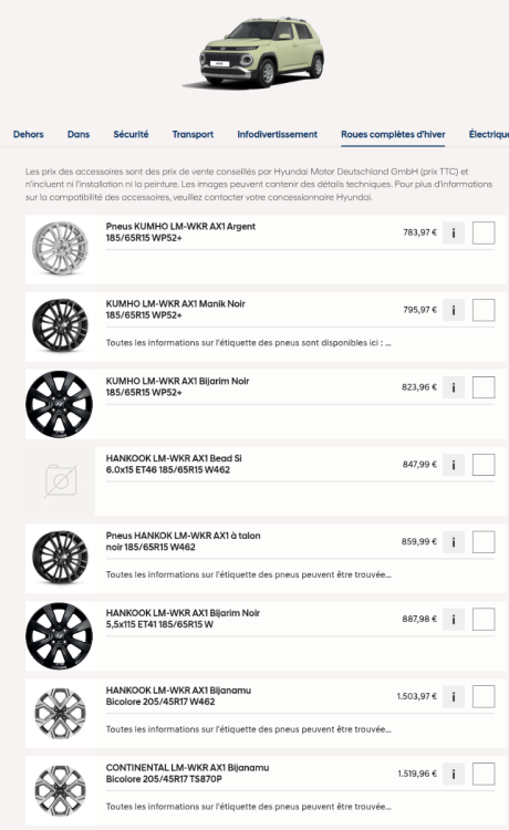À noter que le site de Hyundai Allemagne propose de nombreuses jantes alternatives pour l'Inster 🙂 (voir pièce jointe) ! J'ai d'ailleurs remarqué que sur les sites de vente de voiture Allemand, il arrive de voir des Inster avec des jantes autres que celles que nous connaissons en standard en France (comme sur les images en pièces jointes). Exemple sur mobile.de . -