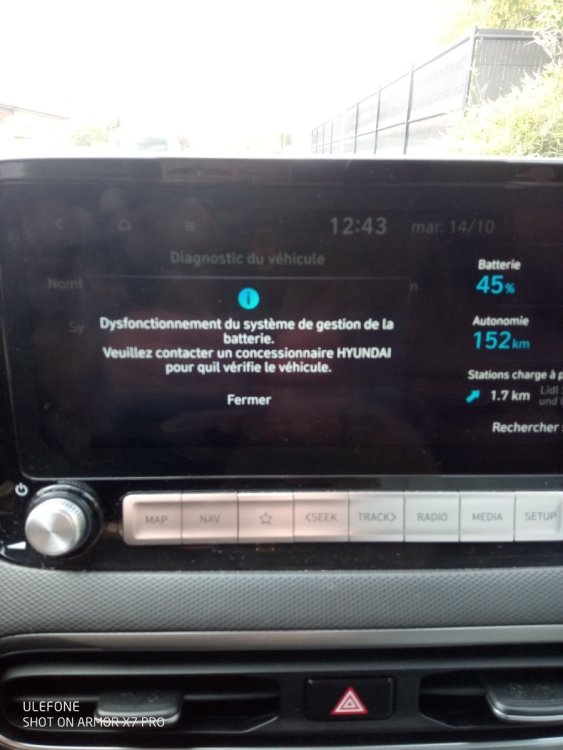 Bonjour, nouveau propriétaire d'un kona 2021 avec peu de km (26000 initialement, 29500 à ce jour) j'ai eu droit à ma première panne hier matin : arrêt du véhicule avec le symbole d'avertissement EV dans un triangle jaune. Impossible de passer la marche avant ou arrière. Au bout d'un certain temps, disparition de l'affichage sur les deux écrans. Après avoir parcouru ce fil, j'opte pour une recharge de la batterie mais vu son age et la rapidité de la panne sans avertissement préalable j'en commande une de meilleur qualité (Yusa 5000 YBX5012 - 54 Ah) Je la reçois dès le lendemain. La recharge de la batterie d'origine me permet de ramener le véhicule chez moi mais il retombe en anomalie à mon arrivé. Après changement de la batterie , un premier message d'erreur me fait une belle frayeur (voir si dessous) et toujours impossibilité d'arrêter le véhicule. En appuyant sur le bouton start sans appuyer sur la pédale de frein il se met enfin à l'arrêt. Je n'ai pas bien compris pourquoi, mais le système semblait bloqué en mode ACC( bouton start rétroéclairé en bleu) Après être sorti du véhicule puis redémarrage : le petit triangle disparait , tout semble ok. Quelques essais plus tard, je me suis rendu chez le cc le plus proche. Arrivant juste avant la fermeture donc pas de possibilité de relever d'éventuel code erreur mais le technicien me laisse ses coordonnés si renouvellement du problème. Leur réseau étant ko , impossible de vérifier les éventuelles mises à jour du BMS ou autre. Plus qu'à croiser les doigts. -