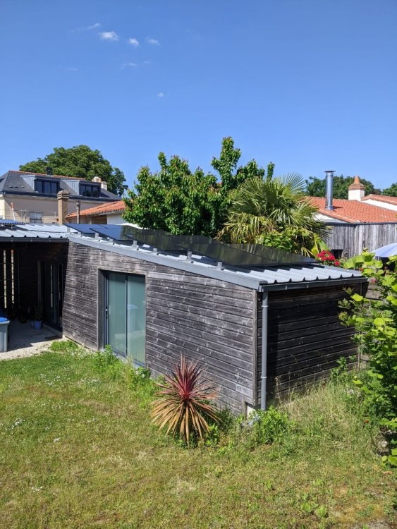 Ce sujet m'intéresse beaucoup ! En mai dernier nous avons fait installer une centrale photovoltaïque sur le toit de notre atelier/garage (voir photo, 3kW crête avec rachat du surplus). Hasard du calendrier, cela a pile poil coïncider avec la baisse du prix de rachat du kWh par EDF OA ! 😢 De 13 centimes quand nous avons signé le devis, c'est passé à 4 centimes quand ça a été installé et validé par EDF OA ☹️. On aurait pu annuler notre commande, mais bon, c'était lancé donc on a maintenu... C'est d'ailleurs cette forte incitation à l'auto-consommation qui nous a poussé à investir dans un véhicule électrique (alors que nous roulons peu, et que notre vieille Twingo de bientôt 30 ans est toujours valide - mais interdite de séjour dans les ZFE...) ! Je ne connais pour ainsi dire rien du sujet de la recharge solaire. J'ai vu l'intéressante vidéo de la Chaîne EV : De votre côté, pourriez-vous détailler le matériel que vous avez installé ? Avez-vous une borne capable de répartir la production solaire entre voiture et maison ? Est-ce piloté par de la domotique ? Dans notre cas, il est à noter que la voiture reste à la maison presque tout le temps puisque nous allons travailler à vélo, et avec le télétravail je suis physiquement au bureau que 2 jours par semaine. D'ici que nous recevions notre Inster, je serai en quelque sorte en pré-retraite 🙂, donc encore plus souvent à la maison, mais aussi avec plus de temps pour profiter des joies de la conduite en VE ! ☺️ Merci pour les informations que vous voudrez bien partager sur la façon dont vous optimisez vos recharges grâce à l'énergie solaire ❤️. Edit : ah oui, j'ai oublié de préciser que le V2H/V2G m'intéresse aussi ! C'est bien pour ça que je me suis battu pour avoir une Inster avec V2L 😉. J'ai compris que cela réclame idéalement une borne de recharge bi-directionnelle n'est-ce pas ? (plus chère et moins courante j'ai l'impression...) -