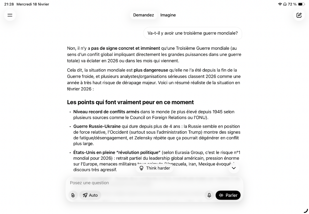 J'ai essayer vite fait le mode conspiration... 😁 Je lui ai demandé: s'il y avait avoir une 3ème guerre mondiale ! 😊 Elle m'a répondu: que ce n'était pas de savoir si mais que c'était sûre qu'elle allait arriver rapidement avec les contrariétés des pays comme usa, Russie, Ukraine, Iran, etc... 😆