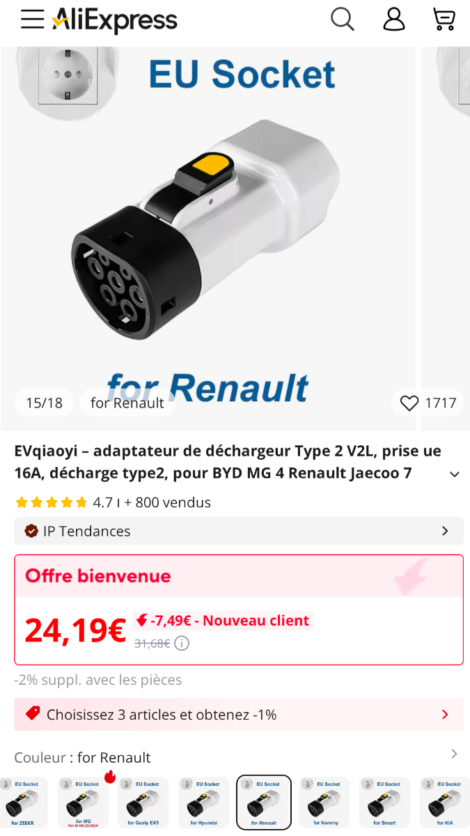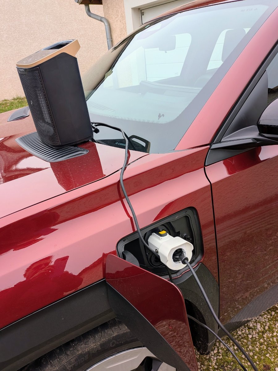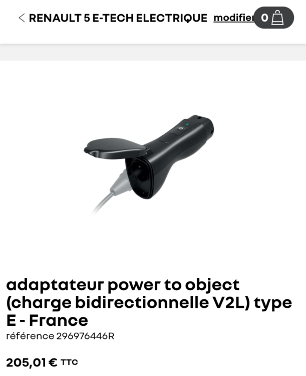 4. Pour l'instant, nous avons peu roulé avec la R4, mais nos premières impressions sont excellentes... Je ferai un retour quand on aura un peu baroudé... Je voulais juste ici vous faire part des essais de V2L de notre R4 en finition 'Evolution' d'entrée de gamme mais avec la grosse batterie. Qui dit V2L - Vehicule to Load (donc utiliser la batterie de 52 kWh pour faire fonctionner des appareils électriques du quotidien), dit 'prise ou connecteur spécial V2L' vendu au catalogue Renault au prix 'modique' de 205€ ou vendu chez Aliexpress au prix de 25€, ou vendu ailleurs, à des prix autour de 150€. (attention de bien choisir avec une prise 230V femelle Européenne - EU Socket - et 'compatible Renault' car il y a une résistance dans la prise qui est consultée par la voiture avant utilisation et chaque constructeur fixe sa propre valeur). Ci-dessous, des exemples de prix (en gros, une poignée en plastique avec quelques contacts métalliques et une résistance... Et tout ça fabriqué en Chine...) ____________________________________________ Vous vous doutez bien que j'ai pris la moins chère et c'est celle que je vais tester ci-dessous. La procédure est légèrement différente de la prise 'Catalogue Renault', mais voilà comment ça marche : 1/ Ouvrir la trappe de charge/décharge de la voiture (comme si vous vouliez 'faire le plein') 2/ Brancher la prise/adaptateur en l'appuyant à fond (comme quand vous rechargez) ... Vous devez entendre le bruit 'Zzzt' du verrouillage de l'adaptateur par la voiture et le témoin lumineux en bas à droite clignote blanc pour indiquer 'je suis en attente'. Ce que le tableau de bord confirme : 3/ Branchez un appareil en 230V dans la prise (ici, pour commencer léger, j'ai mis une radio) 4/ Appuyez 3 secondes sur le bouton métallique sur le côté de l'adaptateur et relâchez-le. Vous allez entendre un bruit qui vient de dessous le capot, c'est l'alimentation qui démarre... Puis la radio fonctionne... Et vous devez voir cette fois le voyant d'état s'allumer en vert : Par curiosité, vous pouvez regarder ce qui se passe au tableau de bord (avant que l'écran ne s'éteigne pour passer en mode 'Economie d'énergie' : La voiture dit qu'on peut écouter la radio pendant 8h57 (j'étais chargé à 78% au début des essais) et qu'elle se déchargera jusqu'à 20% (valeur qu'on peut faire varier dans un menu de la voiture) Par contre, ma radio n'étant que d'une faible puissance... La voiture n'est pas capable de me dire combien de 'Watt' je consomme en instantané. 5/ Pour couper l'alimentation quand vous n'en avez plus besoin, appuyez sur le bouton 'déverrouillage' sous le voyant vert et vous entendez le bruit 'Zzzt' du déverrouillage. 6/ Pour enlever l'adaptateur/prise blanche appuyez sur le bouton jaune de dessus et tirez. Comme je voulais voir ce qui se passerait avec un appareil plus puissant, j'ai poursuivit mon essai en commençant par la position 'ECO' d'un radiateur électrique d'appoint branché directement sur la prise/adaptateur (1000W en ECO) : Ça fonctionne parfaitement et le tableau de bord indique 1 kW de puissance consommée en instantané. ... Avec une première indication de 8h55 de chauffage... Puis, je fais une expérience plus 'touffue' avec une rallonge de jardin de 25 m (de ma tondeuse), et en positionnant le radiateur sur 2000W (sa puissance maxi avec le ventilo à fond) et je laisse tourner quelques minutes pour simuler un chauffage d'appoint dans la maison alimenté par la voiture. Le tableau de bord indique bien 2 kW de consommation... Le câble et l'adaptateur ne sont pas 'chaud' et tout semble fonctionner comme prévu. A noter : Si vous ne 'consommez' rien pendant 1 heure, la voiture estime que vous n'avez plus besoin de rien et éteindra le V2L. Je voulais vous faire profiter de cet essai ... Et trouver un moyen pour retrouver facilement ce 'pense-bête' plus tard.