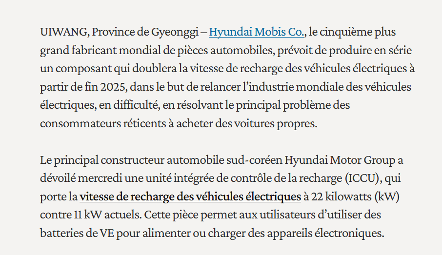 a priori pour l' EV2 ce sera un nouvel ICCU ,puisque avec le chargeur embarqué triphasé 22 kW pour le pack recharge . extrait article Korean car blog Reste à esperer que ce sera un ICCU 100% Mobis et fiable , et non plus Chinois comme celui de mon Inster . Mais pour l'instant depuis Mars 2025 ,0 probléme pour moi.......