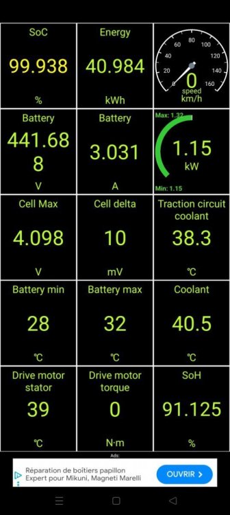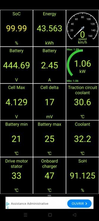OK, jusqu'à la 2021 on pouvait modifier la valeur du tampon haut en augmentant la tension des cellules en faisant simplement une 2° charge une fois chargée à 100% une première fois, il faut essayer sur la tienne. Première charge, valeur de cellule à 4,1V, seconde charge à 4,13V, la capacité augmente mais pas le SOH, Hyundai triche en le modifiant et en supprimant l'historique de charge. -