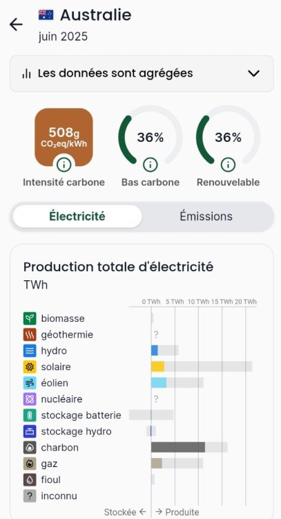 Non. Il ne s’agit pas de "l’Australie", dans son ensemble, mais seulement du "South West Interconnected System (SWIS)". https://en.wikipedia.org/wiki/South_West_Interconnected_System Résau qui concerne 1 million d’habitant (et peu/pas de grosse industrie consommatrice) sur les 3 millions d’habitants de la région d’Australie Occidentale (Western Australia : WA). UNE hirondelle ne fait pas le printemps Et c’est pas fini. Pour le mois précédent le solstice, les stats de la région WA ne sont pas folichonnes : Pour l’ensemble de l’Australie, et ses 27 millions d’habitants, ce n’est guère mieux : ... et, hélas, ils ne le font pas tant que ça : nous n’avons pas de leçons à recevoir de ces gens. Et de citer l’islande (100 % hydro + géothermie) et des pays tropicaux. Désolé, mais 🤣 🤣 🤣 -