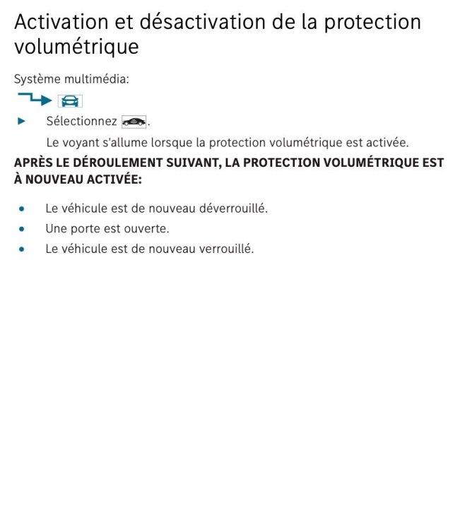 Pour désactive la protection volumétrique (si une personne reste dans l'habitacle, lorsque la voiture est éteinte : vous cliquez sur l'icône avec le dessin d'une voiture : plusieurs réglages sont repris : l'un des derniers concernent la désactivation (ou activation) du volumétrique : je joins la procédure en pièce jointe.