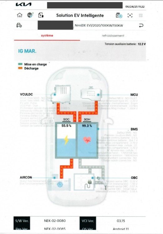 Restons sérieux et laissons là les arguments marketing et simplistes, pour évaluer correctement la durabilité de la batterie du Kia e-Niro 64 kWh (2020 chez moi SOH 99,3% à 55,5% de charge chez Kia le 24/06/2025 à 20 000 km), il est indispensable d’exiger un protocole d’essai standardisé et rigoureux. Un cahier des charges idéal devrait imposer : Des comparaisons sur des e-Niro identiques (même millésime 2020, même pack 64 kWh, chimie NMC) ; La mesure précise des paramètres suivants : kilométrage cumulé, profil de cycles (DoD, C-rate moyen), températures ambiantes et de la batterie, âge calendaire des cellules, SOC moyen et temps passé à haut SOC, répartition des charges AC lente versus DC rapide (puissance et fréquence), style de conduite et énergie régénérée ; Des relevés BMS détaillés avec des RPT (Reference Performance Tests) périodiques pour suivre l’évolution réelle du SOH ; La distinction claire entre calendar aging et cycling aging dans des conditions d’usage réalistes. Tant qu’un tel protocole indépendant n’existera pas, les retours d’expérience sur l’e-Niro 64 kWh resteront approximatifs. Pourtant, ce modèle, équipé d’une batterie LG Energy Solution NMC, mérite des données précises, d’autant que les premières études de flottes montrent une dégradation généralement contenue, mais très variable selon les usages (températures élevées et charge rapide fréquente étant les principaux facteurs d’accélération du vieillissement). Les constructeurs, dont Kia, et les organismes indépendants ont la responsabilité de fournir des données transparentes selon un standard commun. Il est temps d’imposer de la rigueur scientifique sur des véhicules concrets comme l’e-Niro.