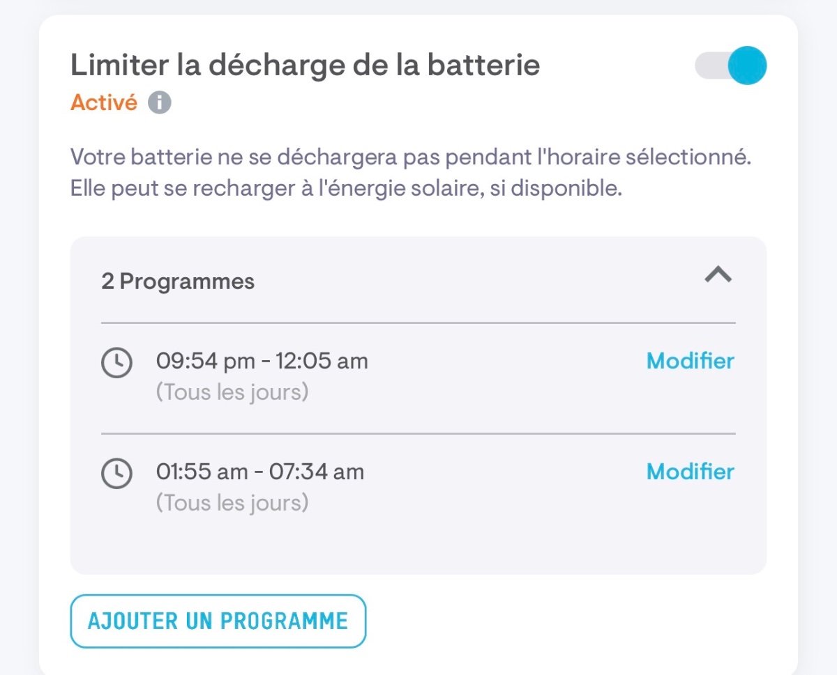 Avec les panneaux solaire pas de soucis car la charge intelligente se passe entre 22h et 7h du matin . Par contre si tu as des batteries solaires il faut faire le réglage pour qu’elle ne se décharge pas pendant la charge de la voiture . Chez moi la charge intelligente se fait en deux fois . Entre 22h et minuit , puis recommence à partir de 2h . Copie écran avec batterie enphase . J’attend avec impatience mi juin 2026 , la charge sera bidirectionnelle . On pourra avec les voitures effacer les pointes de demande , et en remerciement on nous donnera des euros pour charger .