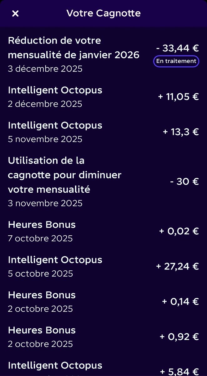 Attention, Intelligent Octopus est un contrat à part entière avec ses propres Conditions Générales de Vente, qui à mon avis ne font pas partie de l'offre négociée par Que Choisir. Cela ne le rend pas moins intéressant, il faut faire vos calculs en examinant la grille tarifaire correspondante et y intégrer les 12 cts cagnotté pour chaque kWh consommé en charge pilotée, et comparer le tout à l'offre Que Choisir sans cagnottage.