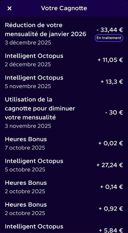 Tu n’a pas pas vérifié comme moi . Au début comme toi je pensais que j’allais perdre ce bénéfice et fait mes calculs si cela vaut le coup de changer . j’ai souscrit Octopus avec que choisir , et je profite aussi de la charge intelligente. Octopus précise que si on ajoute son VE dans l’appli on en profite , et en plus maintenant on peut ajouter un deuxième véhicule ! Vérifié avec iPhone et un vieux smartphone android c’est tout bon ! Du coup je gagne sur tout les tableaux. Octopus cherche vraiment à récupérer tous ceux qui ont un VE. C’est un peu comme IEchage qui propose des bornes de 320 KWh à 0,25 € le KW et dans les coins de campagne où ils y a que du 22kwh . Leur secret des batteries tampons pour acheter l’électricité quand elle ne vaut rien comme le fait Octopus . Également positionné à proximité des sorties d’autoroutes comme le fait Tesla . Cela évite de payer une redevance des sociétés d’autoroute que l’utilisateur final paye .